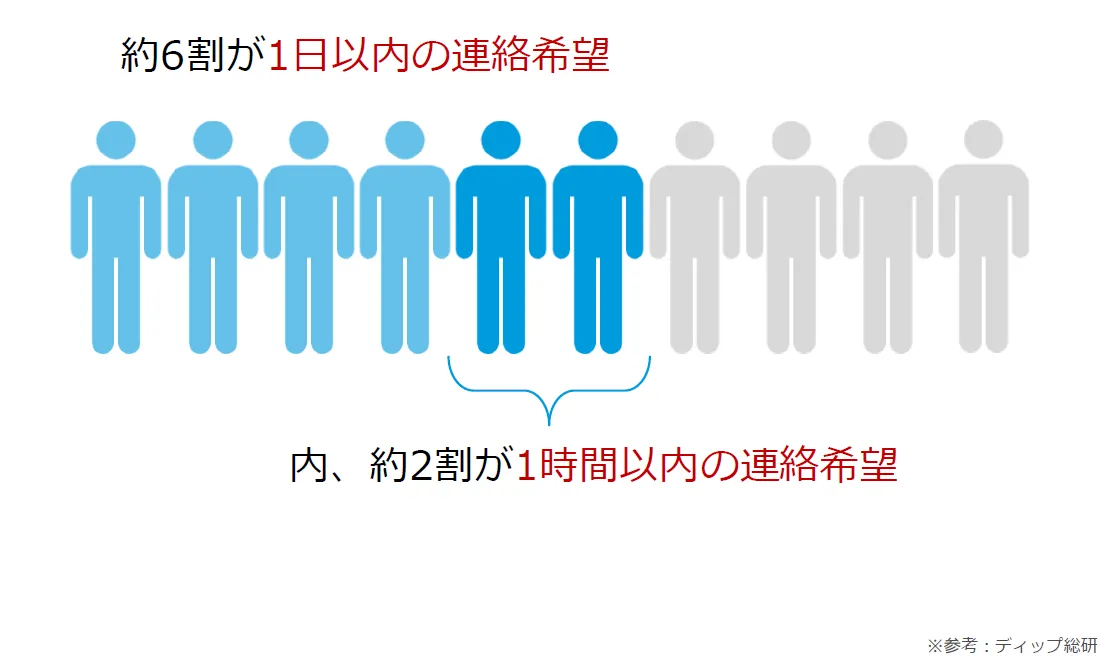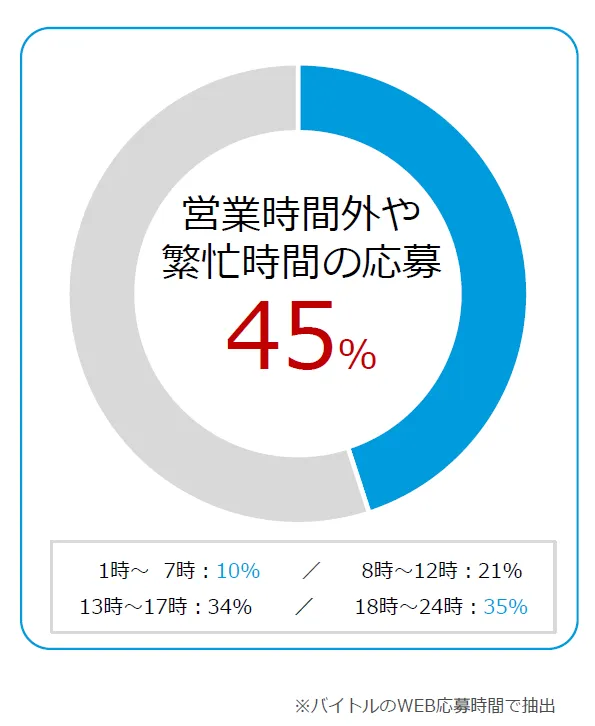 半数近くの求職者が同時複数応募していることに加え、営業時間外繁忙時間に応募しているためターゲットにあった良い人材を面接・採用に繋げるためにはスピーディーな対応が重要です。